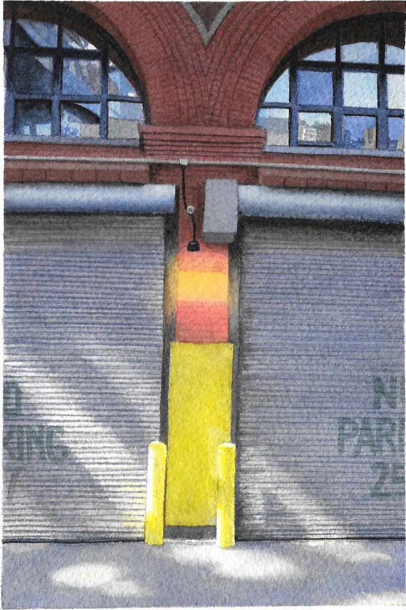 "DUMBO 4," a piece from your DUMBO series, depicts a section of an urban building in the Brooklyn neighborhood. The watercolor showcases a realistic urban scene with a building featuring brickwork, two large metal roll-up doors, and arched windows that reflect the Manhattan Bridge. A vibrant vertical rectangle wall, transitioning from yellow at the bottom to red at the top, is centrally located, highlighting the play of light. Sunlight plays across the roll-up doors and onto the ground, casting dramatic highlights and enhancing the painting’s geometric composition. By blending old-world textures with contemporary elements, “DUMBO 4” pays homage to the distinctive character and vibrant atmosphere that make this Brooklyn hotspot so captivating.