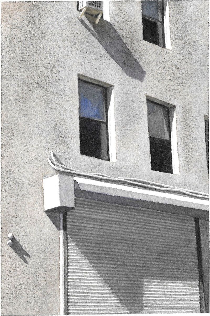 "DUMBO 14" captures a section of an urban building in the DUMBO neighborhood, showcasing the area's blend of industrial and rustic charm. The watercolor depicts a textured gray facade with three rectangular windows in direct sunlight. A closed metal roll-up door, with a strong diagonal shadow cast across it, is situated below the windows. A notable technique used in "DUMBO 14" is the application of granulating color to achieve the concrete texture of the building's facade. The artist has skillfully employed granulating pigments, which separate and settle into distinct patterns as they dry, to mimic the rough, gritty surface of concrete. This technique adds a realistic texture to the gray facade, enhancing the tactile quality of the painting and further emphasizing the industrial character of DUMBO.