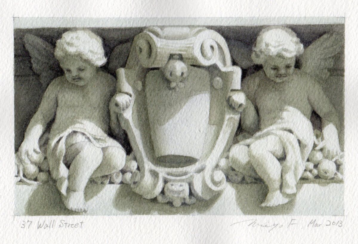 This charming watercolor painting captures two cherubs above the entrance of the historic 37 Wall Street building in the Financial District of Lower Manhattan. The building, originally designed by Francis Kimball and completed in 1907, was once the headquarters of the Trust Company of America. It features a stunning Beaux-Arts facade with a white marble base that includes ornate decorations. The painting employs a focused composition that draws attention to the cherubs, emphasizing their detailed craftsmanship and the playful yet protective character they bring to the building's grand facade. The use of subtle color gradients and delicate brushwork enhances the texture and depth of the figures, making them appear almost lifelike. Add this exquisite painting to your collection to bring a piece of New York City's architectural elegance and historical depth into your home or office, beautifully rendered in watercolor.