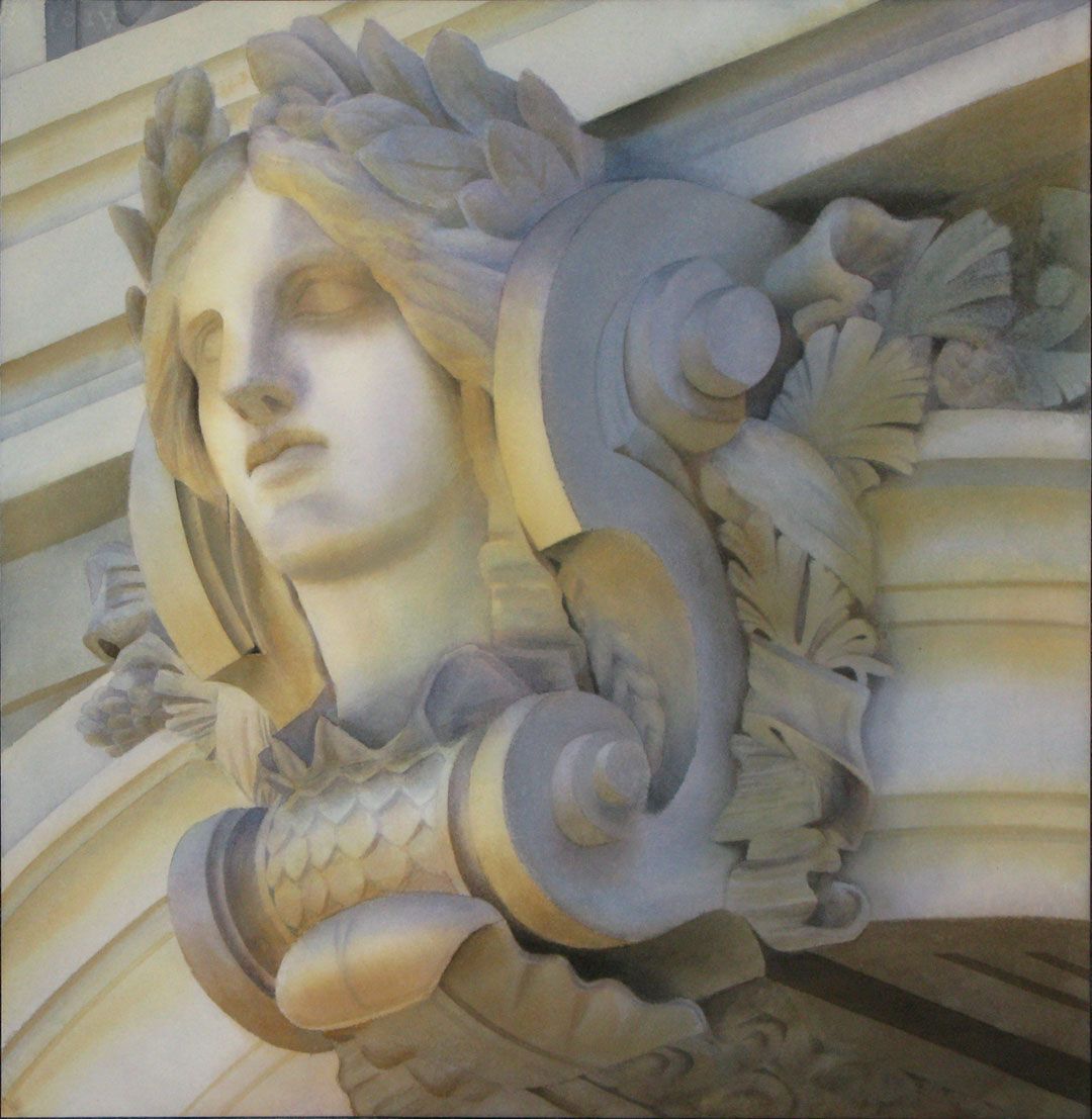 This captivating watercolor painting, "US Custom House II," captures a face above the main entrance of the Alexander Hamilton U.S. Custom House in New York City. The building, designed by Cass Gilbert in the Beaux-Arts style, is a landmark of architectural elegance and historical significance. A delicate blend of soft lavender, orange, and yellow hues, skillfully representing the reflective light of sunset that bathes the sculpture in a warm, glowing ambiance. This painting not only showcases the architectural detail of the U.S. Custom House but also highlights the artist's ability to capture the essence of natural lighting in watercolor. The use of sunset colors enhances the facial features of the sculpture, adding depth and emotion to the historic facade. "US Custom House II" has been recognized for its artistic excellence, featured in "The Best of Watercolor- Splash 13" making it a noteworthy addition to any art collection. Perfect for those who appreciate both architectural beauty and the subtle interplay of light and color, this painting brings a piece of New York's heritage and the tranquility of sunset into your home or office. Add this stunning piece to your collection and enjoy the serene beauty it brings to any space.