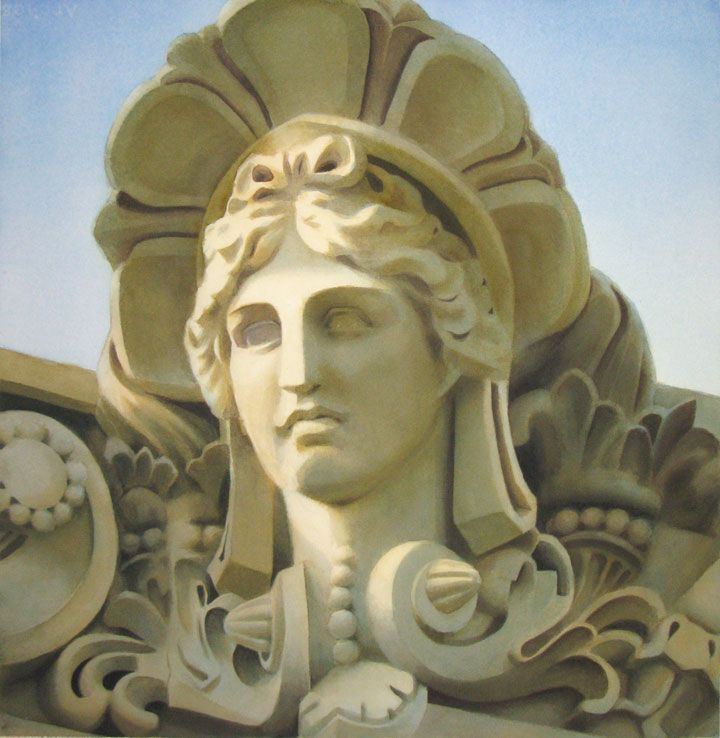 This captivating watercolor painting captures one of the faces decorating the top of the Metropolitan Museum of Art's iconic building on Fifth Avenue. The Met, designed by Richard Morris Hunt, is a renowned example of Beaux-Arts architecture and a New York City landmark. Created in February 2011, this artwork beautifully showcases the sculpture bathed in the warm glow of a late afternoon sun, set against a light blue sky that enhances the serene and majestic expression of the face. Add this exquisite painting to your collection to bring a piece of New York City's art history into your home or office, beautifully rendered in the glowing hues of a late afternoon.
