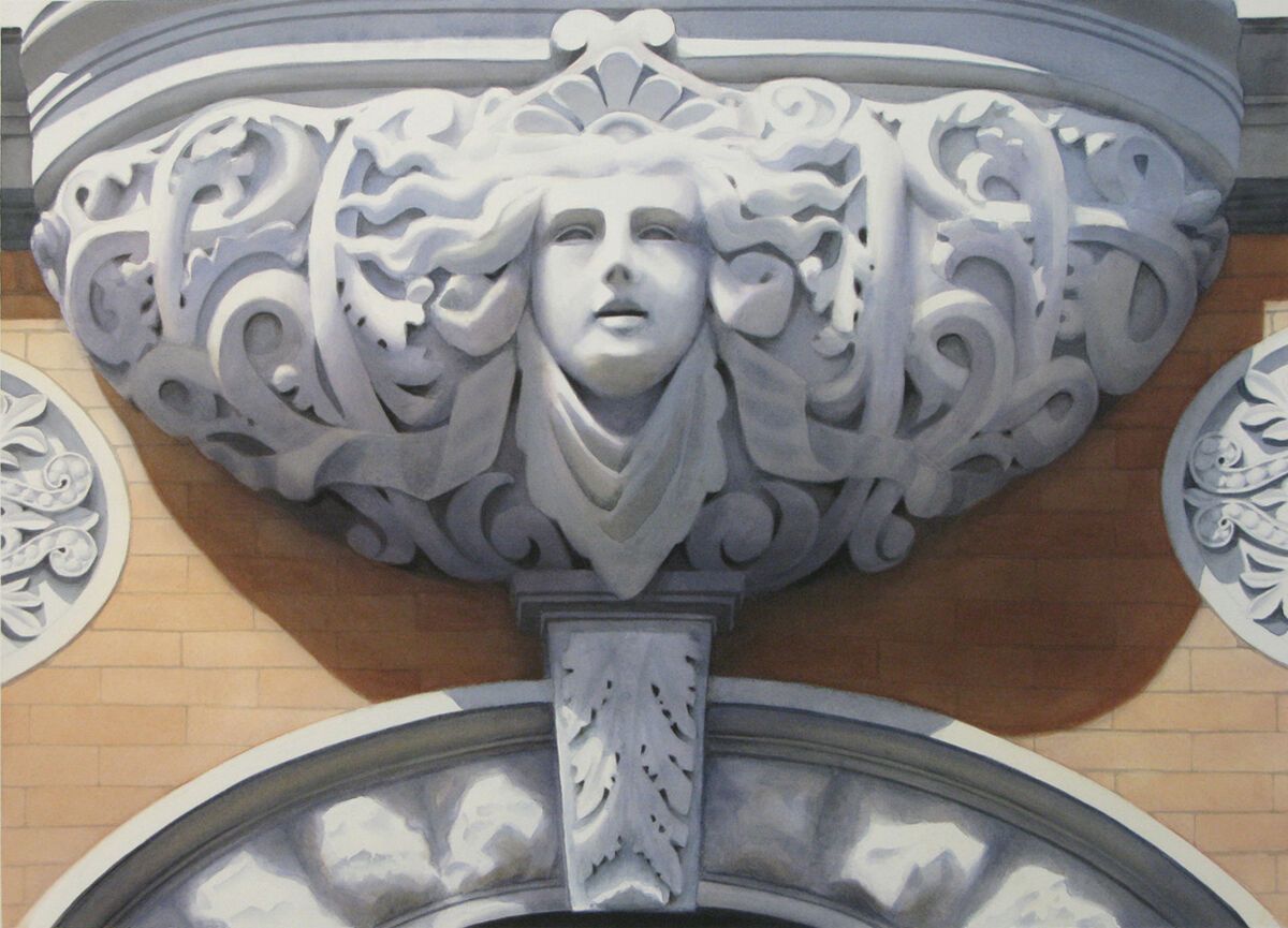 This captivating watercolor painting captures a sculpted face located between the 4th and 5th floors of a building at 69 8th Street in New York City's East Village. The face is part of an intricately designed architectural detail, featuring a Medusa-like decoration surrounded by flowing hair and elaborate carvings. This design is reminiscent of Baroque or Rococo styles, known for their ornate and curvilinear motifs. The strong summer sunlight casts clear shadows on the face, creating a sense of depth and highlighting the intricate details of the sculptural elements. This lighting emphasizes the three-dimensional quality of the piece, giving it the appearance of a solid presence. The face, surrounded by flowing hair and ornate decorations, is not only a testament to the craftsmanship of the era but also a symbol of the timeless beauty that persists in the ever-changing landscape of New York City's East Village. Add this exquisite painting to your collection to enjoy a daily reminder of the architectural beauty and historical depth that New York City has to offer, beautifully rendered in a style that bridges the past with the present.