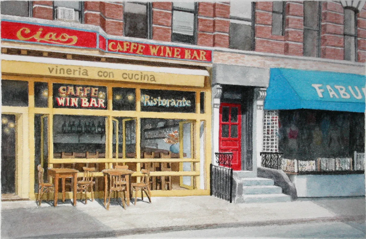 This painting captures the essence of a quintessential New York City street corner, where the charm of Little Italy comes alive. The scene is reminiscent of a place where one can relax in the sun, enjoy a glass of wine, and savor a bite to eat amidst the bustling streets of Manhattan. It offers a slice of Italy in the heart of the city, blending cultural heritage with urban vibrancy. Neighboring the bright façade, a distinct red door leads to apartments overhead, set against a contrasting grey wall; to the right, a storefront with a cheerful blue awning adds further depth to this lively street corner. This original watercolor artwork is perfect for anyone who appreciates the blend of urban vibrancy and cultural heritage.
