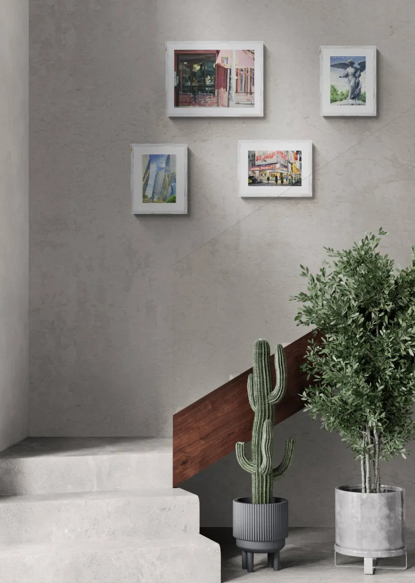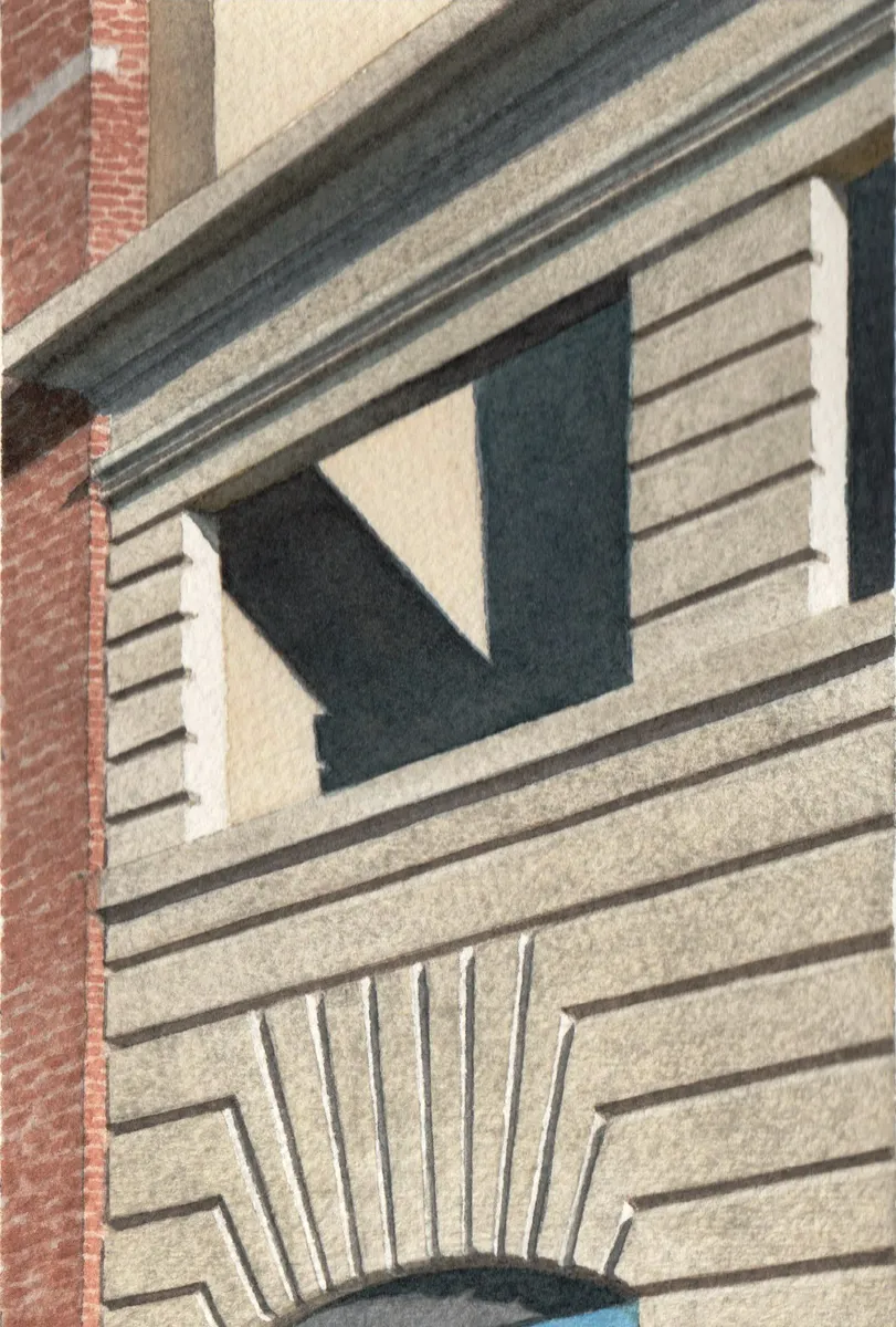 “DUMBO 12” is a watercolor painting portraying a building façade with a mix of architectural elements. Linear stonework creates a textured surface, punctuated by a series of horizontal lines that emphasize the structure’s geometry. A window in the composition casts a distinct triangular shadow onto the adjacent building, while a segment of brickwork on the left side offers an intriguing contrast in materials. Through careful attention to perspective and the interplay of light and shadow, the piece achieves notable depth and highlights the harmonious balance of shapes that typifies this Brooklyn neighborhood’s industrial-meets-modern aesthetic.