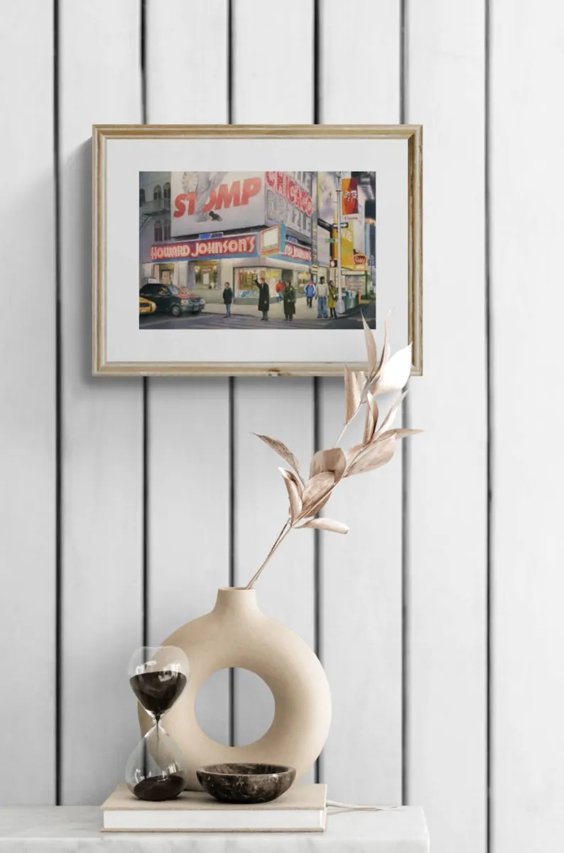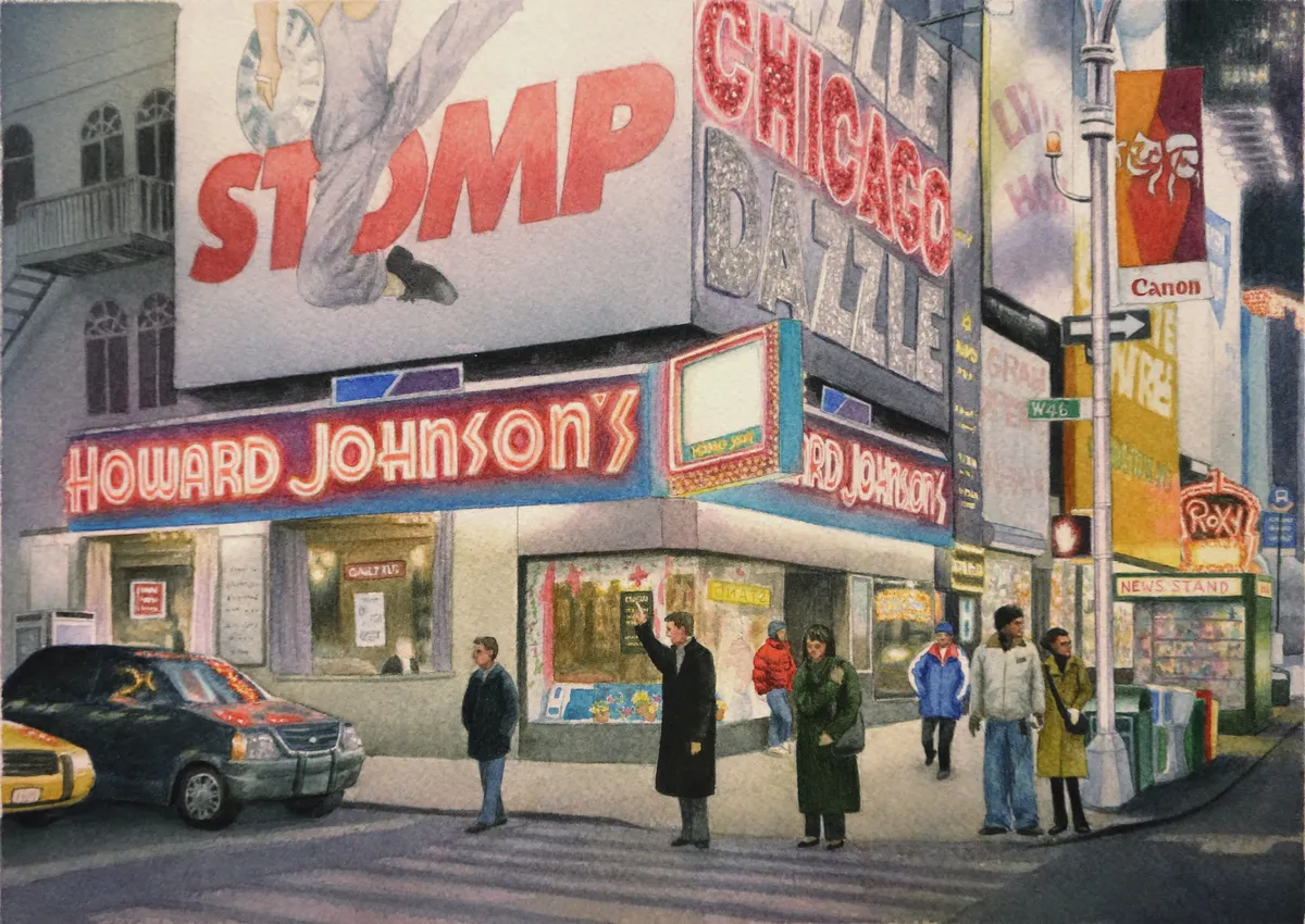 Part of the New York Street Series, this watercolor painting captures a nostalgic piece of American history: the Howard Johnson's restaurant once located at 1551 Broadway in the heart of Times Square. The scene depicts the iconic restaurant beneath the bright theatrical signs of Broadway shows "STOMP" and "CHICAGO," preserving a moment in time when this historic chain still graced New York's entertainment district. Howard Johnson's, fondly known as "HoJo's," was once America's largest restaurant chain, pioneering the franchise concept that revolutionized the American dining industry. In its heyday during the 1960s and 1970s, the chain boasted nearly 1,000 locations across the country, each marked by their distinctive orange roofs. The restaurants were famous for their 28 flavors of ice cream, fried clams, and signature hot dogs served in grilled butter-brushed buns. This Times Square location was one of the last Howard Johnson's restaurants in operation, representing the final chapter of a brand that helped define American roadside dining for over seven decades. From its humble beginnings as a drugstore soda fountain in 1925 to becoming a nationwide phenomenon, Howard Johnson's holds a special place in American cultural history. This painting preserves the memory of this once-mighty restaurant chain, capturing its final years amid the bright lights of Broadway, before its eventual closure in 2005.