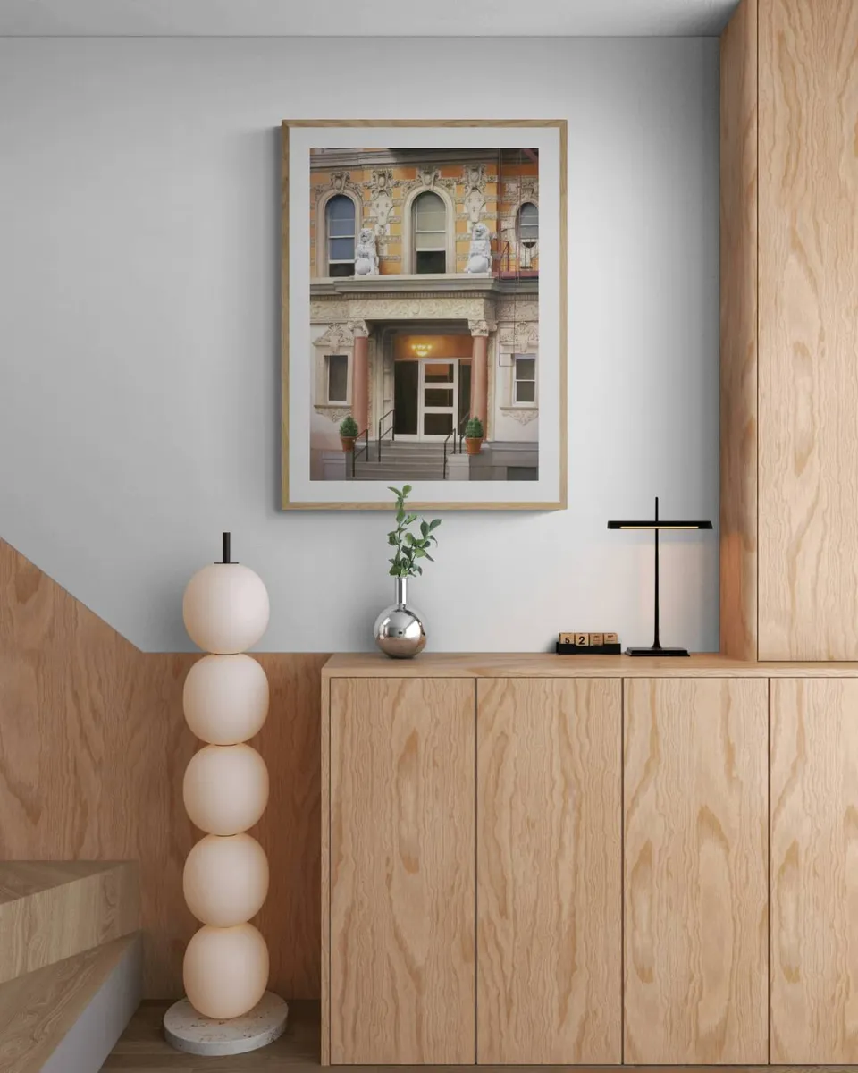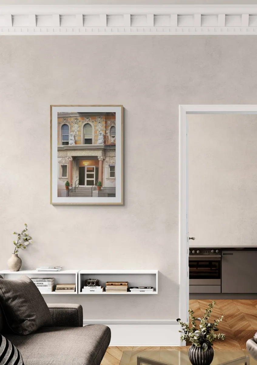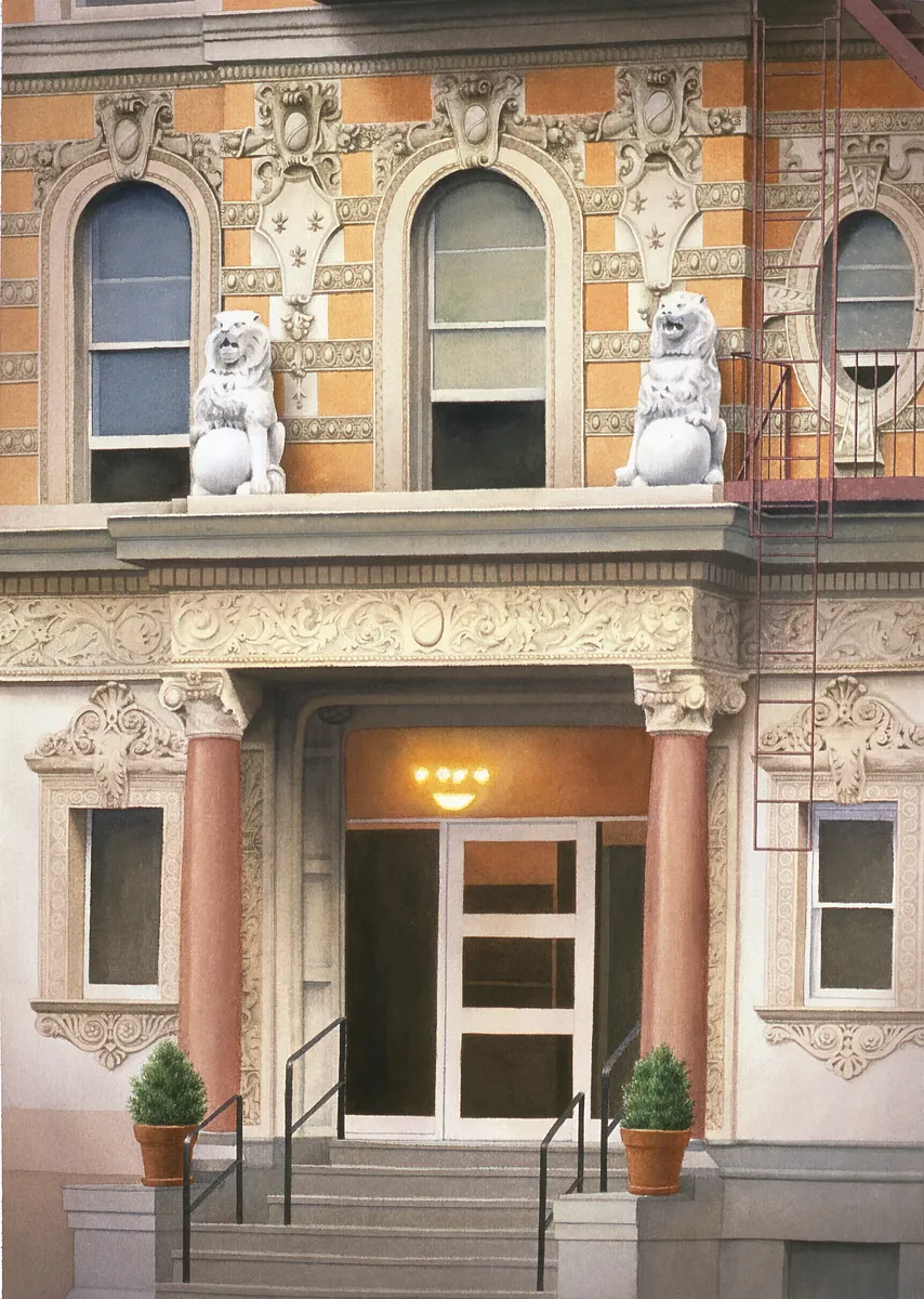 "2020 Broadway" is a captivating watercolor painting that beautifully captures the essence of a pre-war landmark, constructed in the year 1900 and located near the Lincoln Center. This historic building, with its classic architectural style, stands as a testament to the grandeur of the past. The artwork showcases the building's facade in a way that highlights its ornate carvings and decorative stonework, features that are characteristic of the period's architectural style. The painting's focal point is the grand entrance, featuring a double door with glass panels, flanked by two vibrant red columns. Adding to the building's imposing presence are two symmetrical lion statues, positioned on ledges above the entrance. The artist has skillfully used the watercolor medium to bring out the intricate details of the stonework and the majestic forms of the lions, their stony gaze overlooking the scene with an air of regal authority.