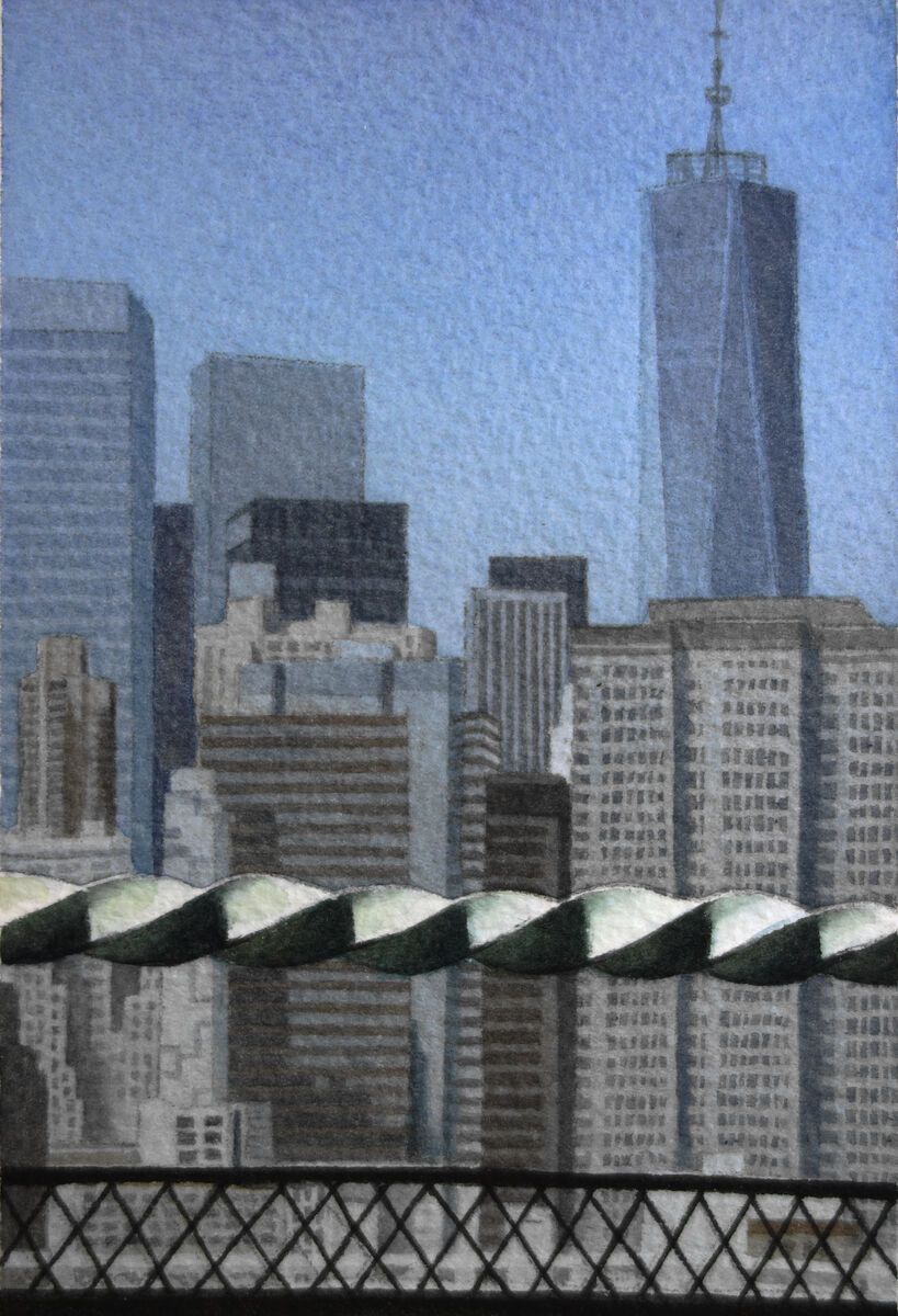 “DUMBO 22” is a watercolor painting that forms part of a small series inspired by Brooklyn’s Down Under the Manhattan Bridge Overpass (DUMBO). This scene unfolds beneath the Brooklyn Bridge overpass, where a prominent stop sign and a parked silver vehicle occupy the immediate foreground. Towering in the background is a grand arched bridge, its brickwork meticulously detailed, complemented by a small patch of greenery that softens the industrial atmosphere. Through careful attention to light, shadow, and structural geometry, the painting encapsulates the dynamic interplay between architecture and nature within this urban setting.