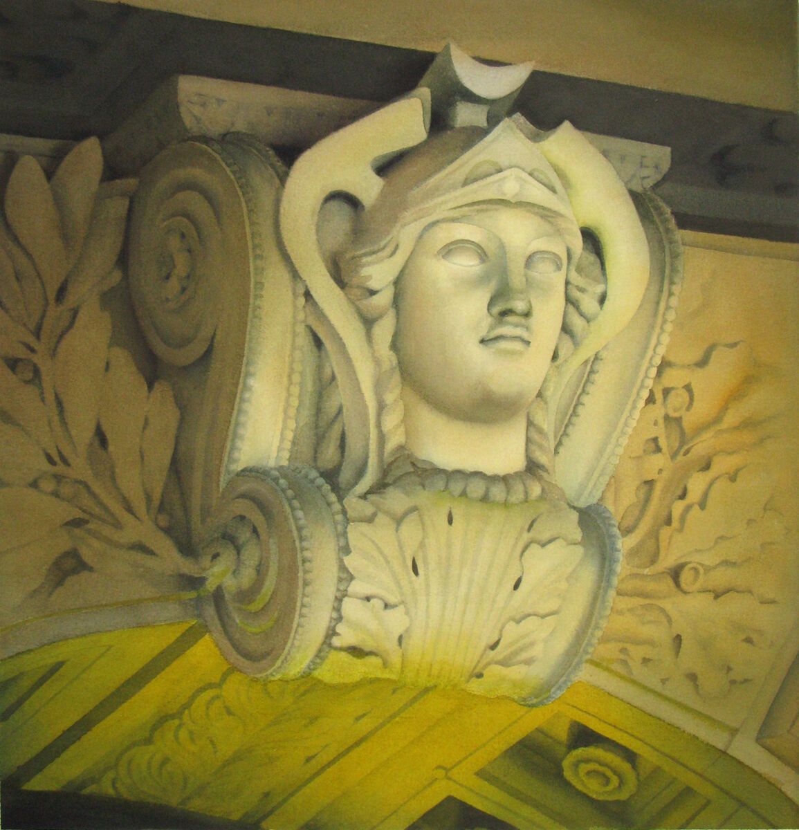 This captivating watercolor painting captures a face above the entrance of the University Club of New York, located at 1 West 54th Street in Midtown Manhattan. The building, designed by McKim, Mead & White, is a renowned example of Renaissance Revival architecture and a New York City landmark. The painting's color scheme is dominated by orange gold, capturing the warm glow of the face above the entrance under the soft light of night. This palette creates a sense of elegance and sophistication, reflecting the club's prestigious status as one of New York City's most exclusive social clubs. Add this elegant painting to your collection to bring a touch of sophistication and historical richness into your space, beautifully rendered in the luminous hues of a night in the city.