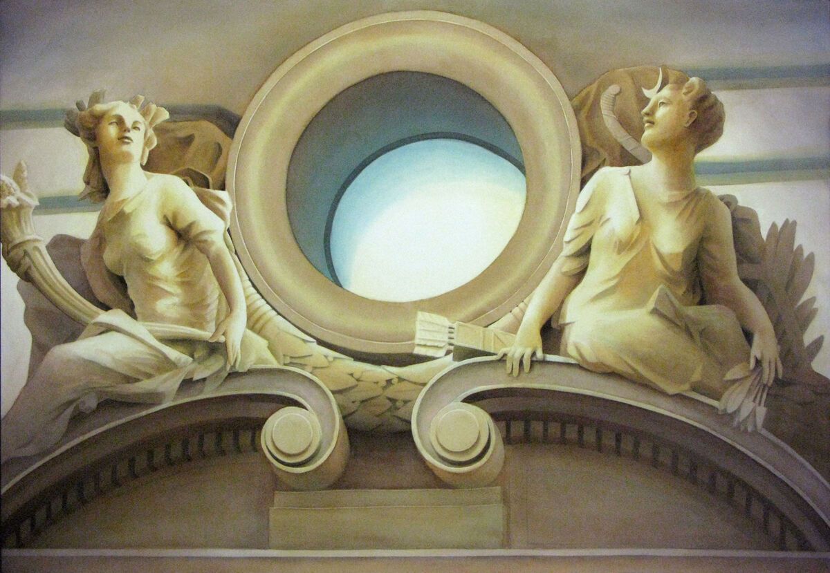 "Peninsula Hotel III" is part of a series celebrating the architectural beauty of the Peninsula Hotel. A pair of statues depicting the ancient Roman goddesses Ceres and Diana located above the main entrance on 55th Street. The painting uses a vibrant color scheme with soft orange and yellow hues on the figures, giving them a warm glow. The turquoise blue in the bull's-eye window and subtle purple in the outer corners create a striking contrast, adding depth and visual interest. The use of watercolor medium allows for a delicate and nuanced portrayal of the hotel's facade, highlighting its intricate details. This artwork is a compelling addition to any collection, offering a beautiful interpretation of a New York City landmark. Its blend of architectural significance and artistic style makes it a standout piece for those who appreciate both history and beauty.