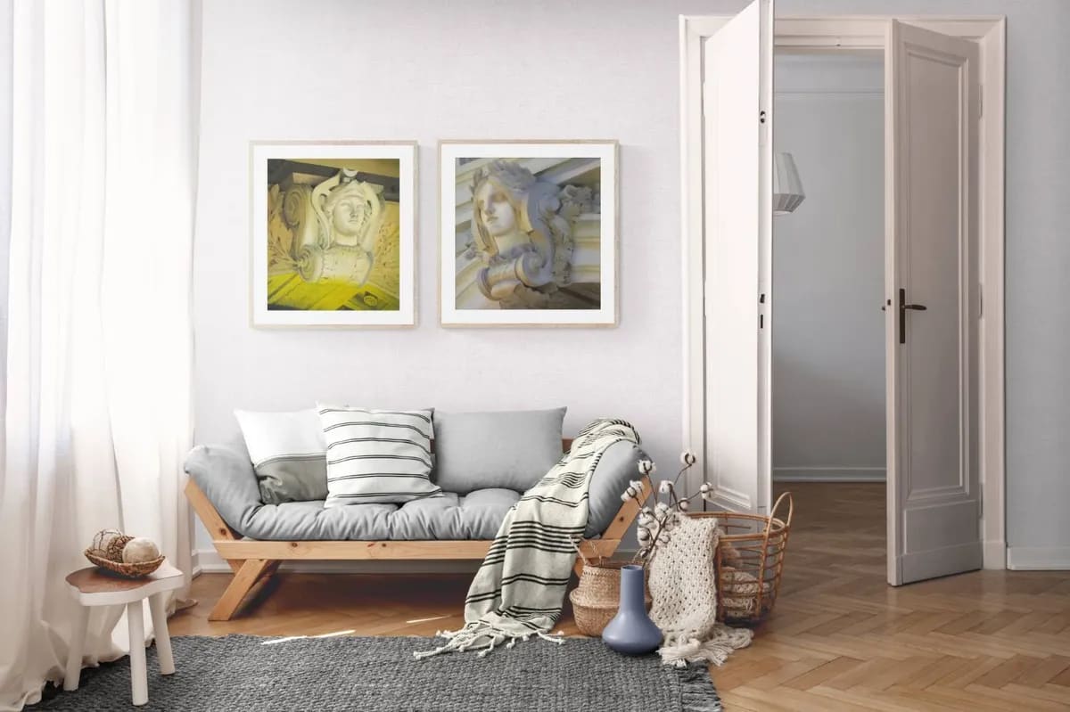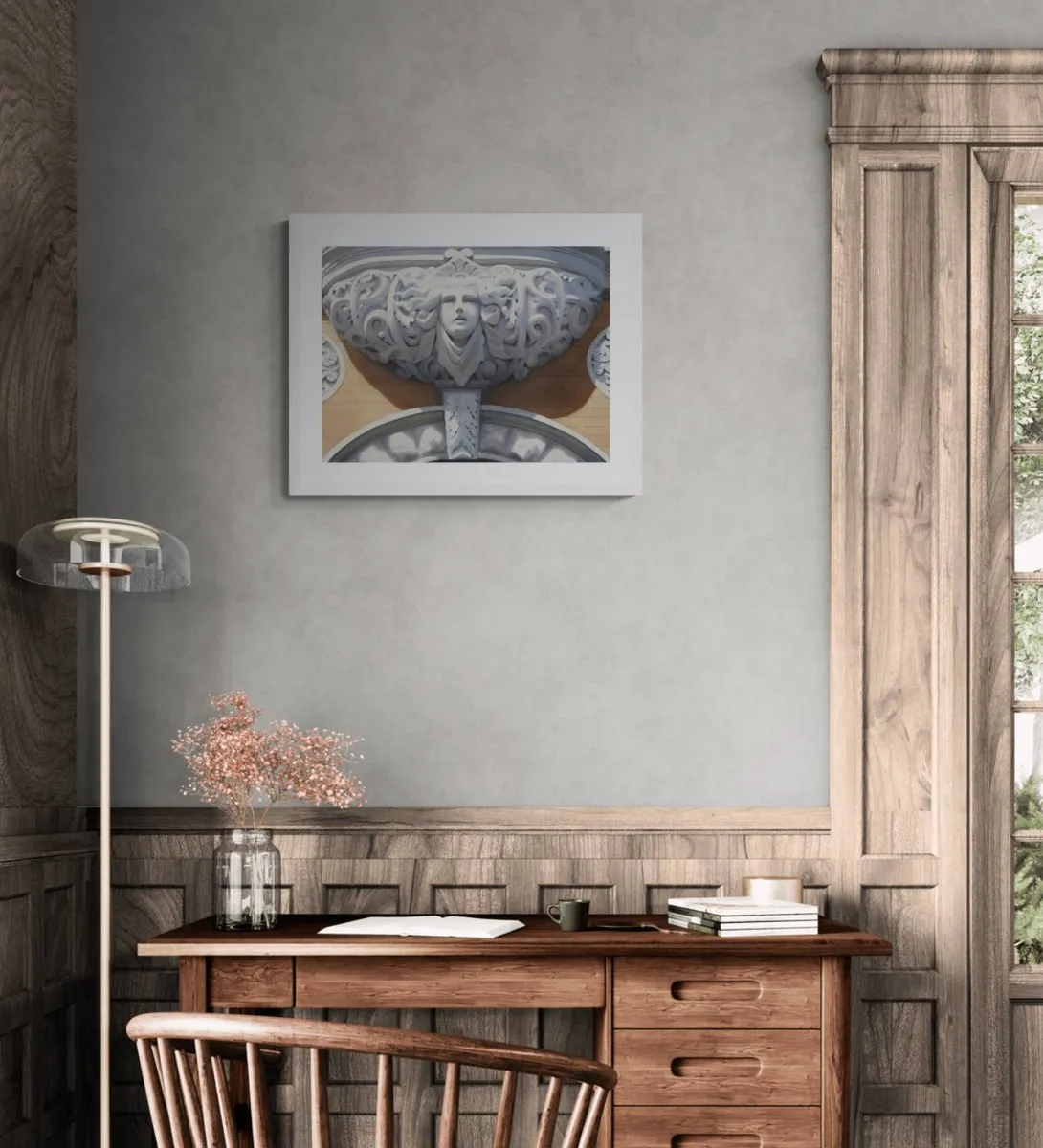 This captivating watercolor painting captures a sculpted face located between the 4th and 5th floors of a building at 69 8th Street in New York City's East Village. The face is part of an intricately designed architectural detail, featuring a Medusa-like decoration surrounded by flowing hair and elaborate carvings. This design is reminiscent of Baroque or Rococo styles, known for their ornate and curvilinear motifs. The strong summer sunlight casts clear shadows on the face, creating a sense of depth and highlighting the intricate details of the sculptural elements. This lighting emphasizes the three-dimensional quality of the piece, giving it the appearance of a solid presence. The face, surrounded by flowing hair and ornate decorations, is not only a testament to the craftsmanship of the era but also a symbol of the timeless beauty that persists in the ever-changing landscape of New York City's East Village. Add this exquisite painting to your collection to enjoy a daily reminder of the architectural beauty and historical depth that New York City has to offer, beautifully rendered in a style that bridges the past with the present.