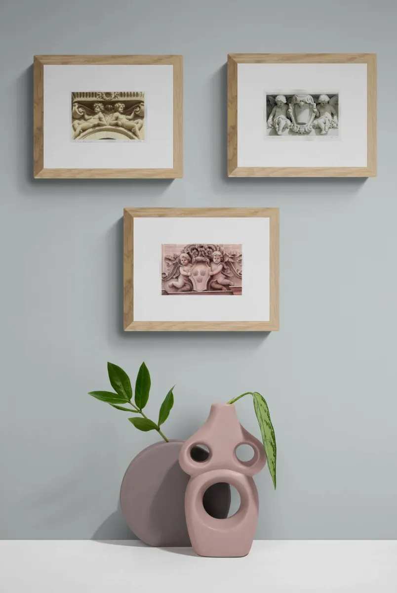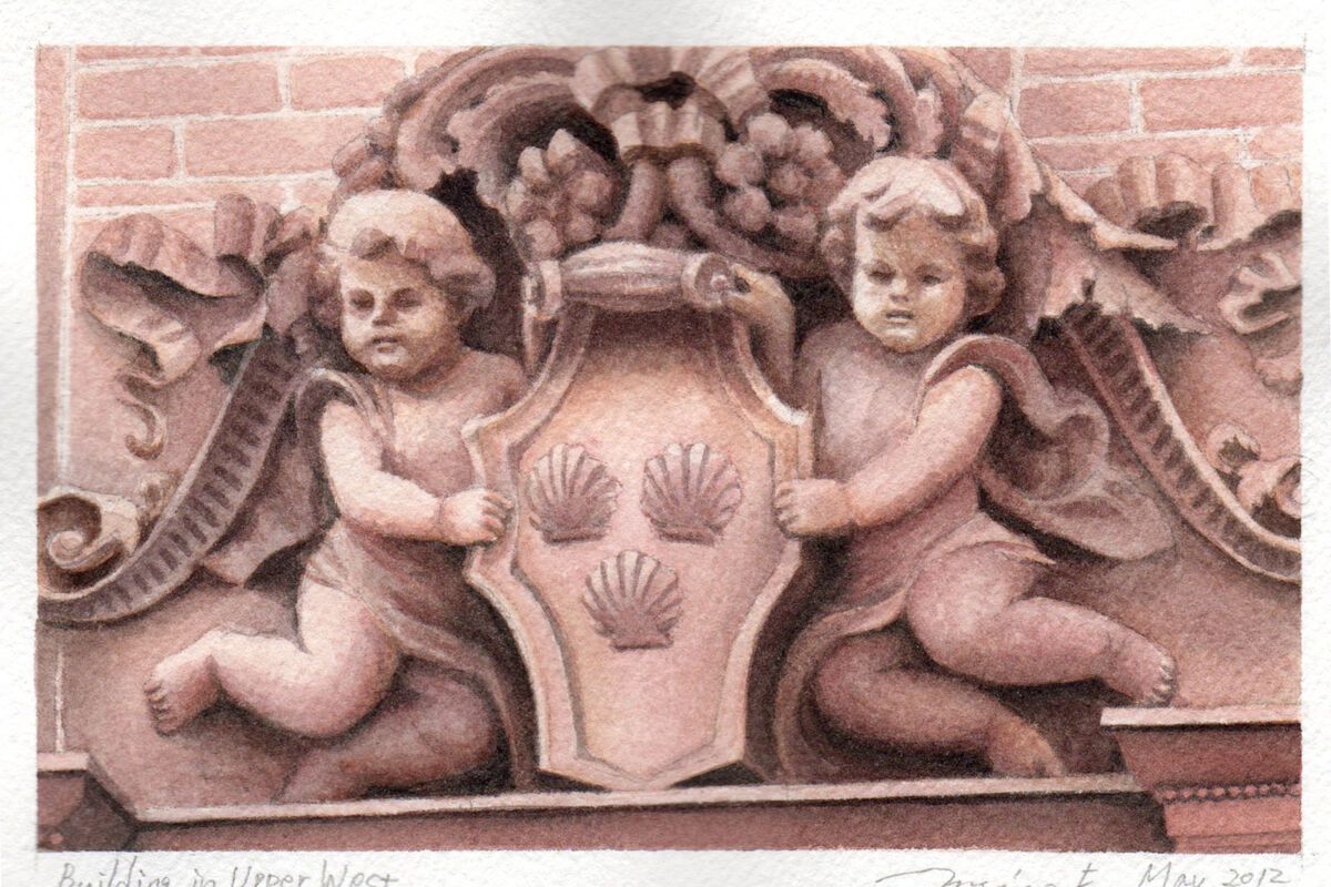 This painting captures an exquisite architectural relief adorning a historic building in New York City’s Upper West Side. At its heart, two cherubs rendered in a classical Renaissance style flank a central shield embellished with three scallop shells—a motif often symbolizing pilgrimage, protection, or familial heritage. The relief’s intricate carvings are brought to life through layered washes of muted Burnt Sienna, soft Red, and weathered grays, evoking the patina of aged stone. The watercolor medium lends an ethereal quality to the scene, with translucent layers suggesting sunlight diffusing across the facade’s textured surface. Rooted in Beaux-Arts or Neo-Renaissance design traditions, this piece celebrates the neighborhood’s architectural legacy—a quiet homage to craftsmanship often overlooked in urban landscapes. The restrained palette and fluid brushstrokes soften the relief’s formality, inviting viewers to contemplate stories etched into the city’s stone: guardianship, history, and beauty enduring amidst modernity.