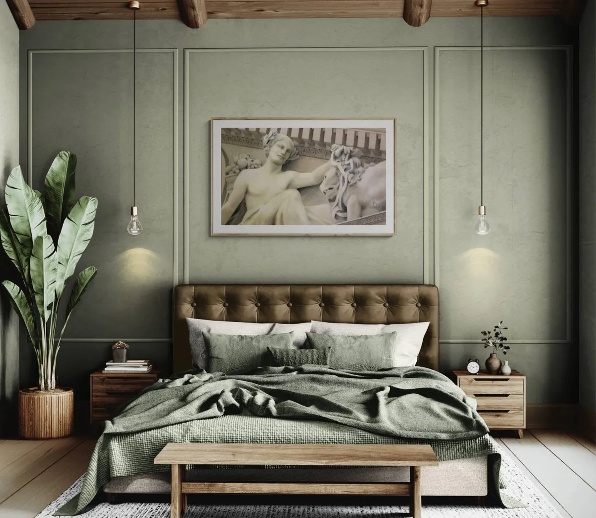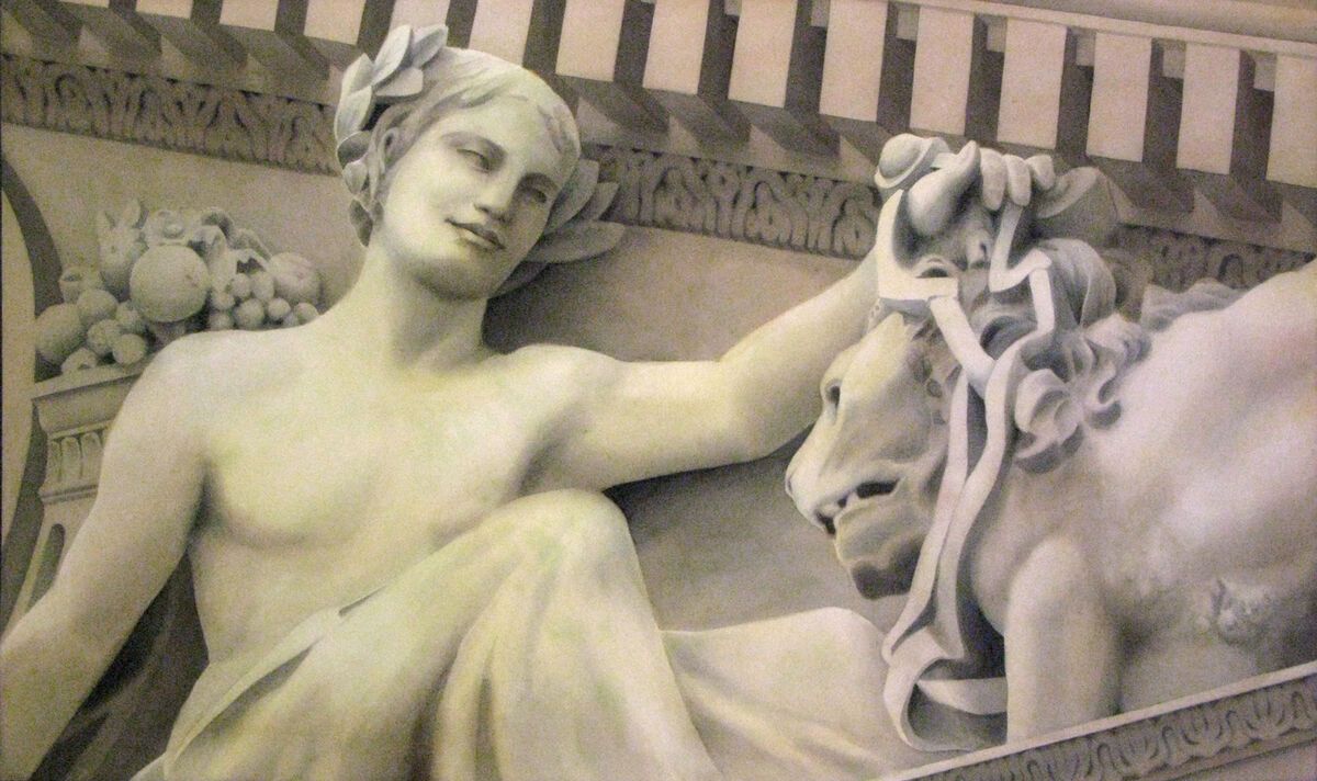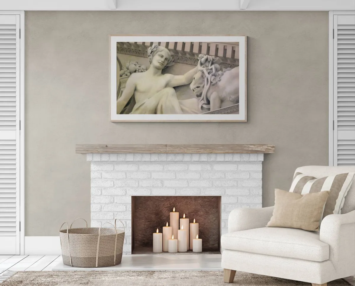 This painting captures the intricate sculpture from the pediment of the historic Bowery Savings Bank Building at 130 Bowery. This artwork is part of a twin set that focuses on the symbolic figures flanking a central clock, each accompanied by a lion, representing the timeless themes of time and industry. The Bowery Savings Bank Building, designed by Stanford White of McKim, Mead & White, is a landmark example of neoclassical architecture. Its facade is adorned with Corinthian columns and sculpted pediments by Frederic MacMonnies, evoking the authority of ancient Rome. This artwork is a compelling addition to any collection, offering a beautiful interpretation of a New York City landmark. Its blend of architectural significance and artistic style makes it a standout piece for those who appreciate both history and beauty. This particular painting vividly portrays the male figure, symbolizing industry, in a dynamic pose as he tames a lion.