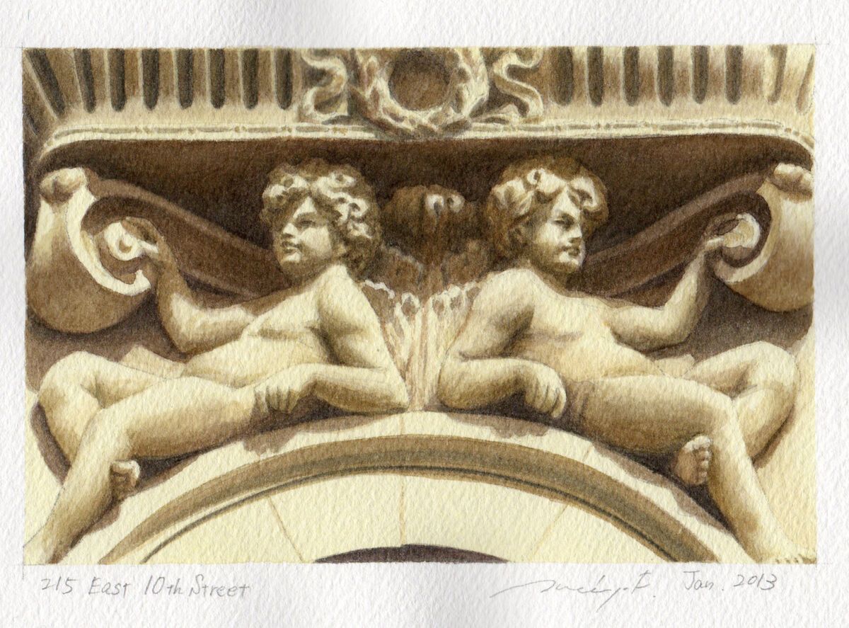 "215 E 10th Street" is a charming 6 x 4-inch watercolor gem that captures a delightful architectural detail of a historic residential building, built in 1900 in New York City's East Village. Created in January 2013, this artwork beautifully portrays an effigy above an arched window, featuring two boys leaning on each other, symbolizing camaraderie and support, all bathed in the bright light of a summer day. This small-scale painting is a perfect addition to any art collection, offering a unique glimpse into the architectural and cultural richness of one of New York City's most beloved neighborhoods.