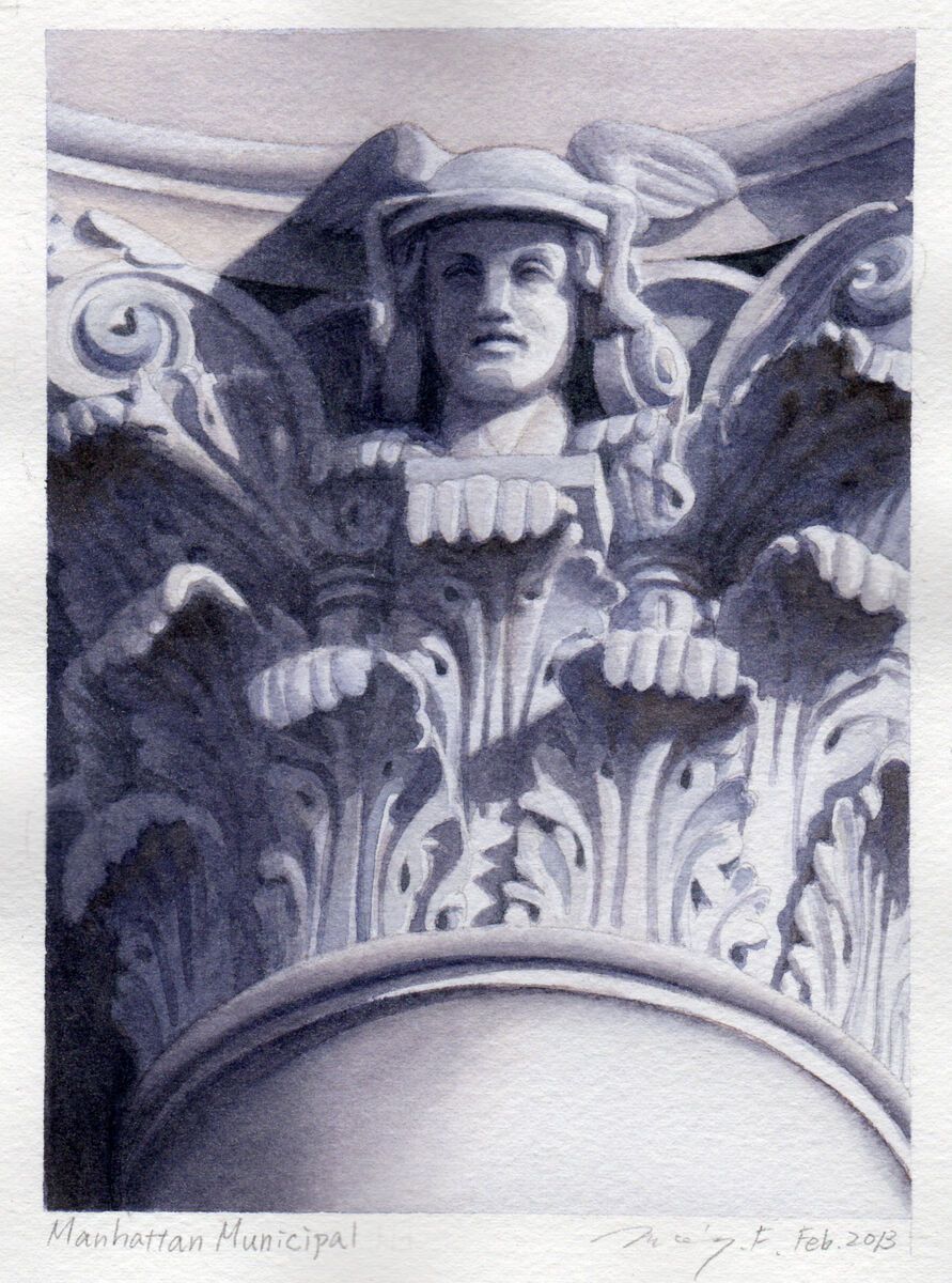 "31 Chambers," a charming 6 x 4-inch watercolor painting that captures the delightful figures of two baby statues perched atop the mansard roof of the historic 31 Chambers Street building. Created in February 2013, this artwork beautifully contrasts the intricate detail of the statues against a bright blue sky, emphasizing their playful and whimsical nature. The historic Surrogate's Courthouse at 31 Chambers Street in downtown Manhattan is completed in 1907, is a renowned example of Beaux-Arts architecture and a New York City landmark. This small yet captivating painting offers a unique perspective on a timeless architectural landmark, focusing on the beauty and elegance of its sculptural details. The depiction of the babies against the bright blue sky adds a sense of joy and vitality to the composition, highlighting the artist's interpretation of the building's character.